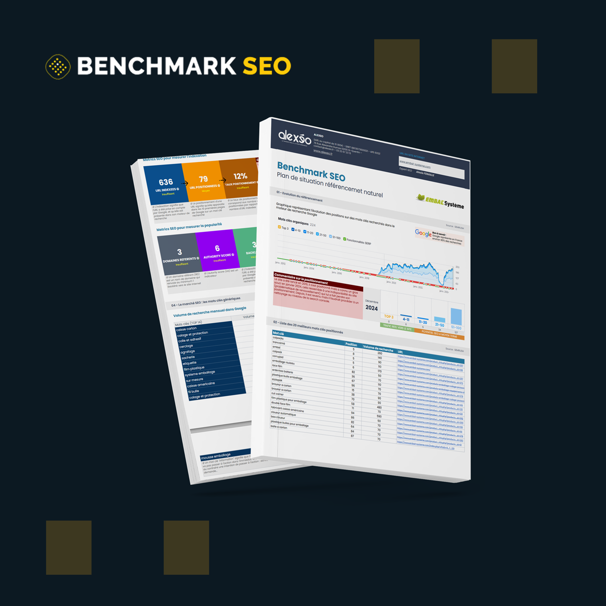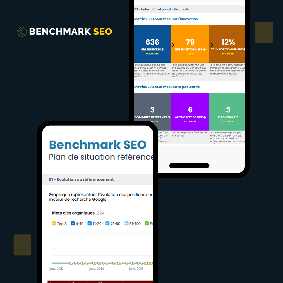 Le Benchmark SEO est une étude approfondie du référencement naturel de votre site internet. Il s’agit d’un document PDF de 4 pages qui permet de disposer d’une analyse comparative de votre marché SEO et celui de vos concurrents. Cela permet d’avoir un point de situation SEO, d’obtenir les conseils d’un expert SEO sénior (plus de 15 ans d’expérience) et de se situer par rapports aux concurrents présents sur le marché.